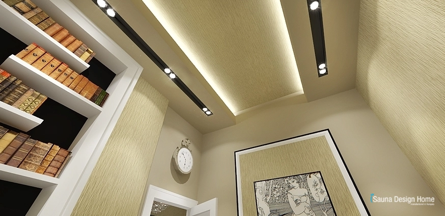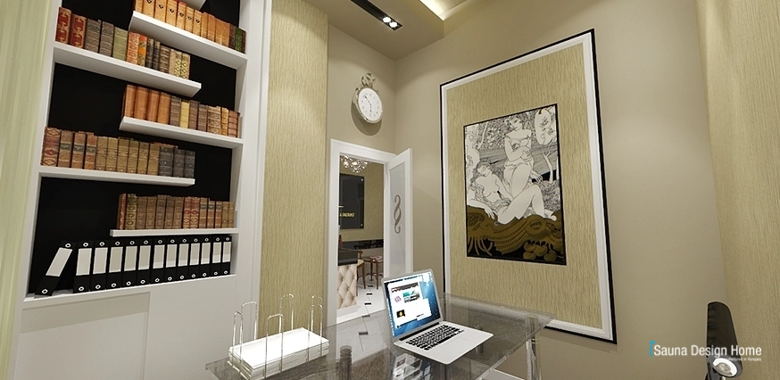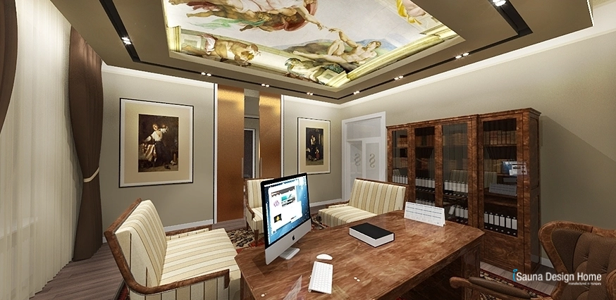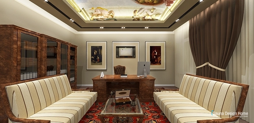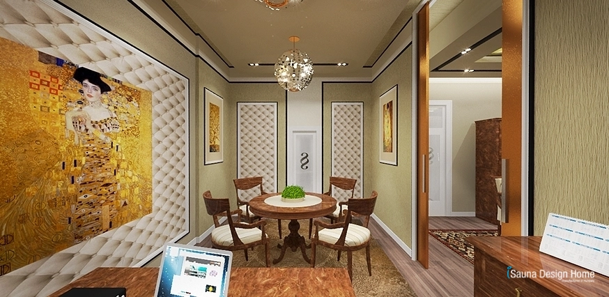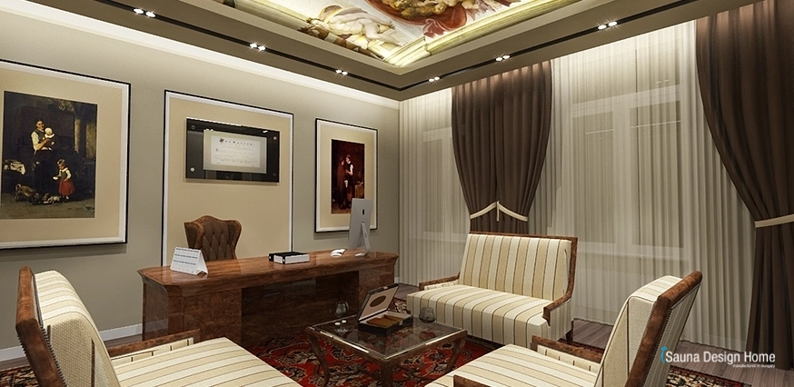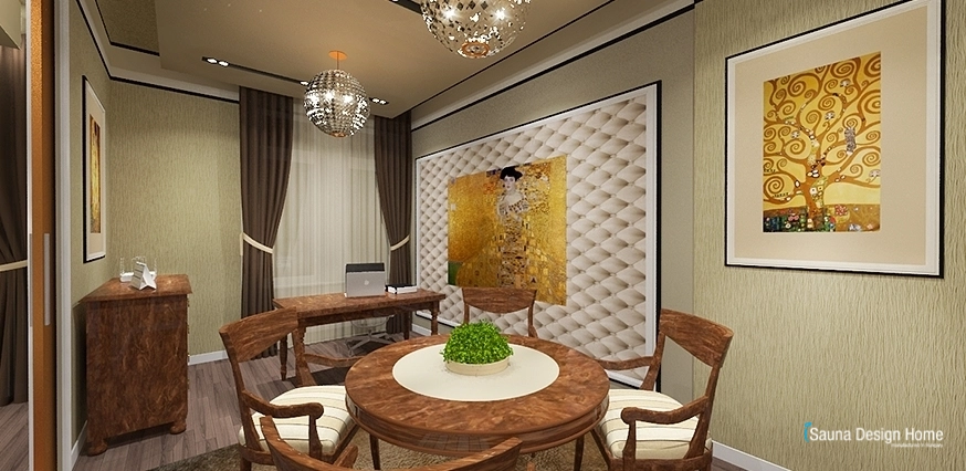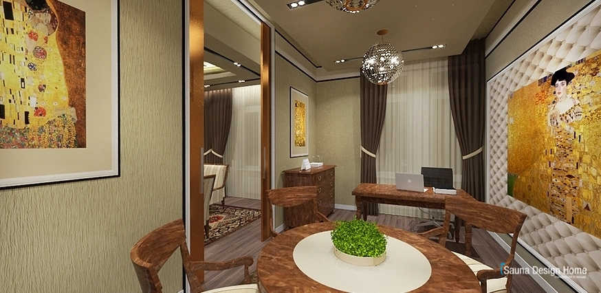 Tu sú prešívané obklady béžovej farby, gulaté kríštáľové lustre. Vo faloštnom strope zapustené moderné osvetlenie zabezpečuje vhodné osvetlenie k práci. V miestnosti sa nachádza jeden písací a okrúhly stôl v klasickom štýle.