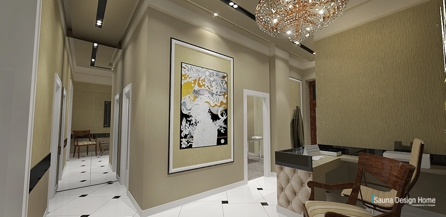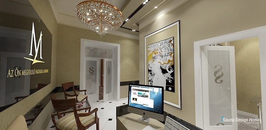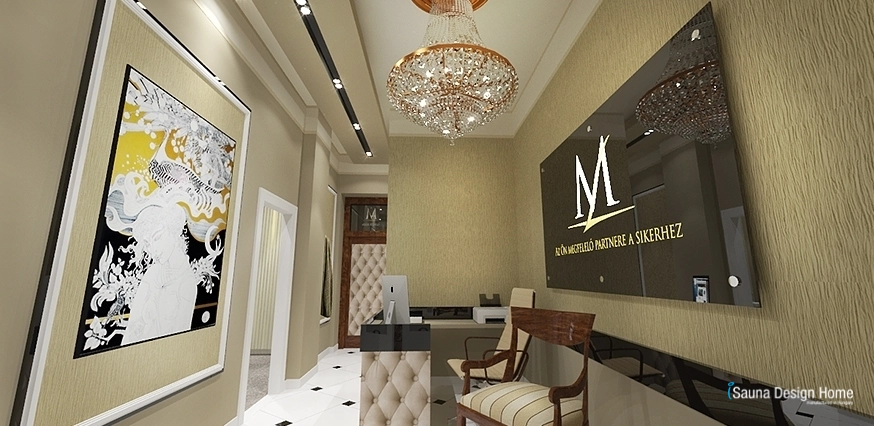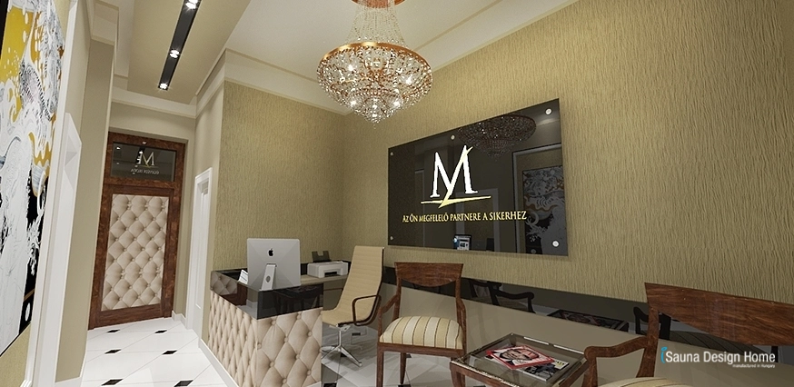 Eleganciu recepcie sme museli prispôsobiť už jestvujúcému obkladu v štýle art deco. Počas interiérového dizajnu sme museli vychádzať a zosúladiť vsetko odtiaľto. Erb podnikania je zvýraznene umiestený v hale, kde zvyšuje elegantnosť jeden reprezentatívny krištáľový luster. Pult pre sekretárku bol vybudovaný šetrne na miesto a takto zostalo miesto i pre vytvorenie malej čakárne pre klientov.