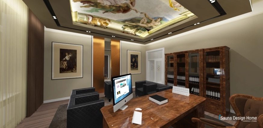 Najväčšia kancelária má najvyššiu úroveň. Pri rozhodujúcom klasickom nábytku sa jemne zjavujú i jednotlivé prvky moderného štýlu. V priestore je v prevahe elegancia. Najefektívnejším elementom miestnosti je faloštný strop, na ktorom sa zjavuje známa časť stropnej nástennej maľby Sixtínskej kaplnky. Toto riešenie interiérového dizajnu robí naozaj jedinečnou advokátsku kanceláriu a v nej nášho klienta a jeho úspešní tím.
