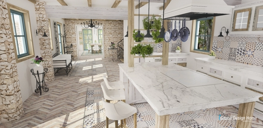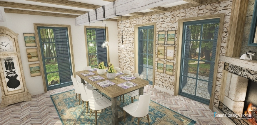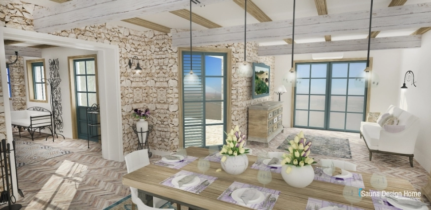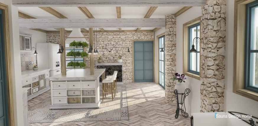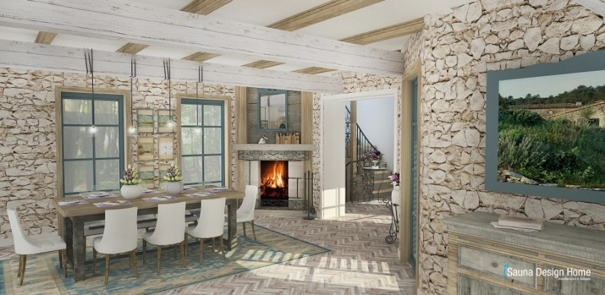 Počas projektovania interiéru bola obytná plochanavrhnutá tak, aby doplnky, farby, materiály, nátery a prírodny kameň boli typické na tento štýl.