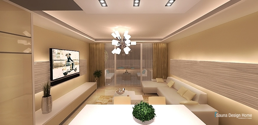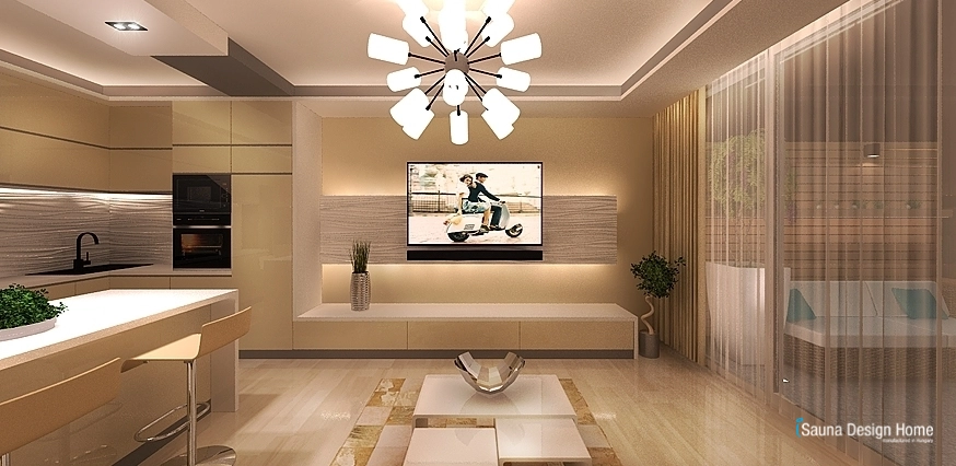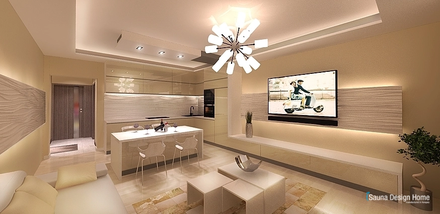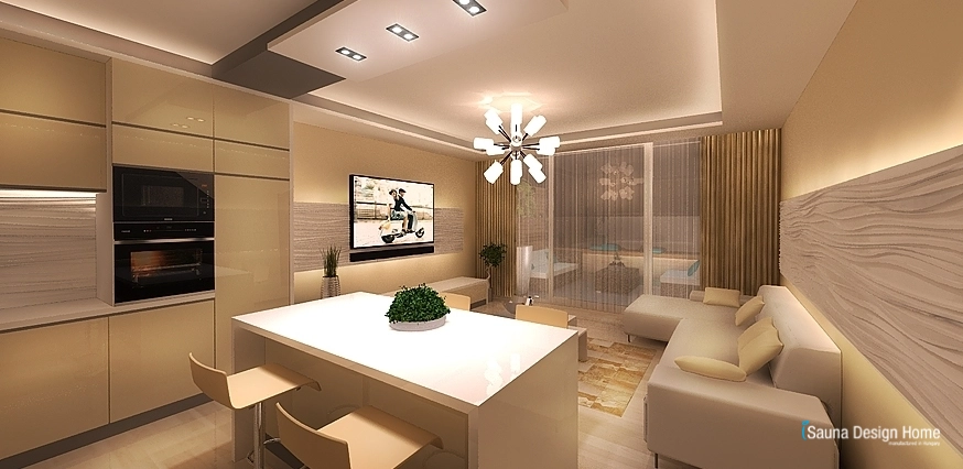 Obývačka - kuchyňa v jednom otvorenom priestore predstavuje zjednotený obraz bytového zariadenia s modernými skrytými LED lampami, s vysoko lesklou kuchynskou linkou, ktorá sa otočí do nábytku obývačky a takto spajá dve funkcie.