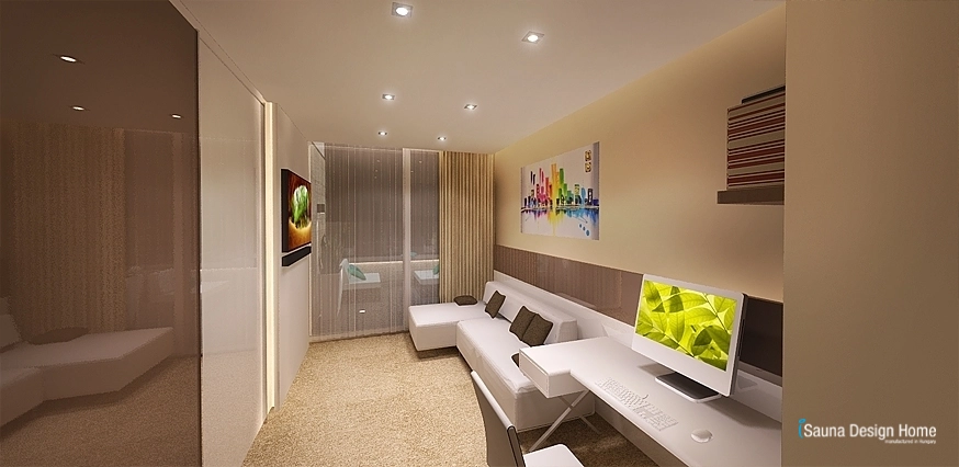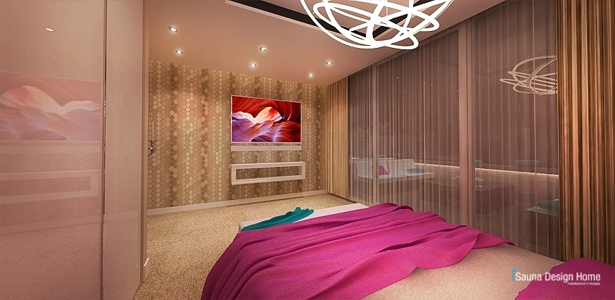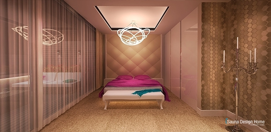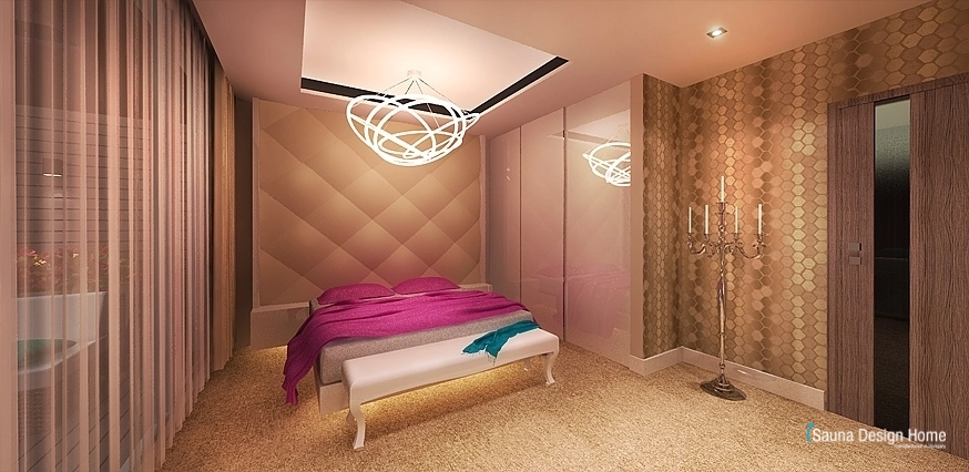 V spálni je zobrazená aj klasická forma interiérového dizajnu, čo sa odráža v doplnkoch. Spáľňa je vybavená vlastnou tapetou. Francúzky prešívaný povrch zadnej steny manželskej posteli a špeciálny LED luster dáva Glamour nádych izby.