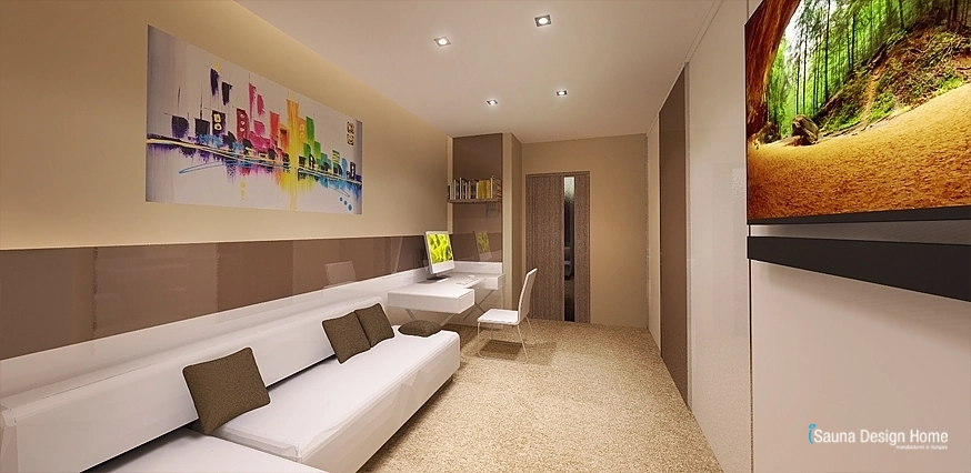 Detská izba tiež dostala vysoko lesklý nábytok, ktorý dáva v trochu inom odtieni imidž miestnosti. Písací stôl na mieru a skryté LED osvetlenie predstavujú tvary modernej interiérovej architektúry.