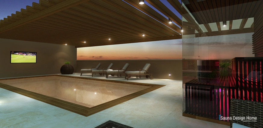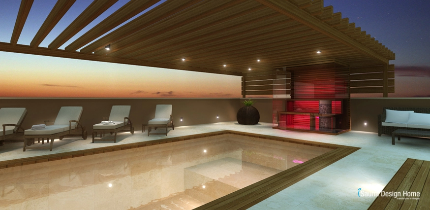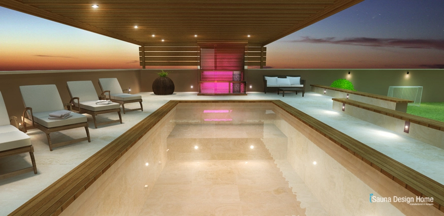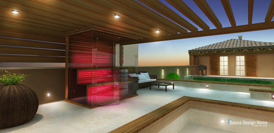 K wellness tarase patrí fínska sauna v minimalistickom štýle, priestranný bazén, a pohodlný oddychový priestor s útulným osvetlením a krytom.