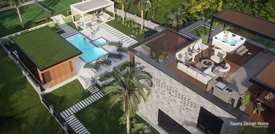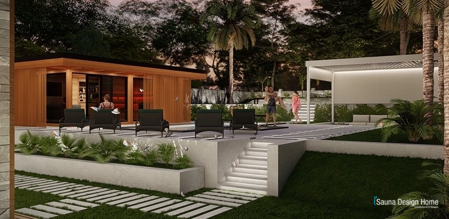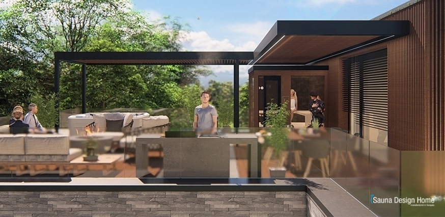 V záhrade sme tiež vytvorili profesionálne vybavené, nezávislé kúpeľné centrum, ktoré zahŕňa fínsku saunu s funkciou pary, jedinečnú kuchynskú stenu, chladničku vína. V oddychovej zóne je jedinečná TV stenu z masívného kanadského červeného cédrového dreva a tiež sem patrí aj vodný blok.