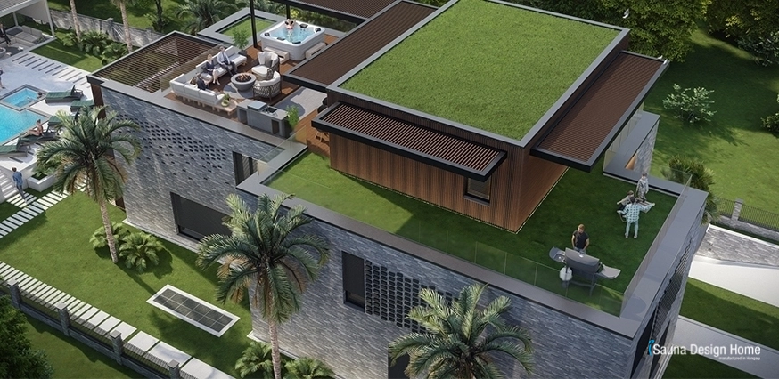 Aj v tejto exkluzívnej časti sa dôsledne opakuje už dobre známa dekoratívna štruktúra dreva a lamiel, aby spojila wellnes - spa časť so štýlom domu. V zadnej časti záhrady je voľná zelená plocha vhodná na šport. Každý bod záhrady je majstrovsky navrhnutým umeleckým dielom v dokonalej harmónii.