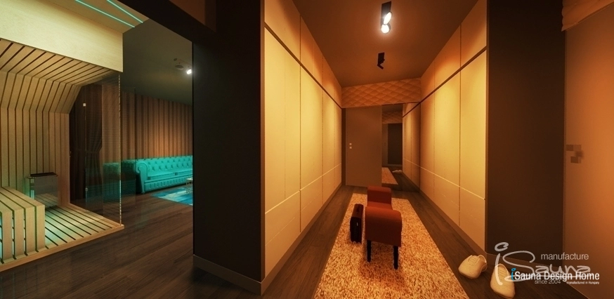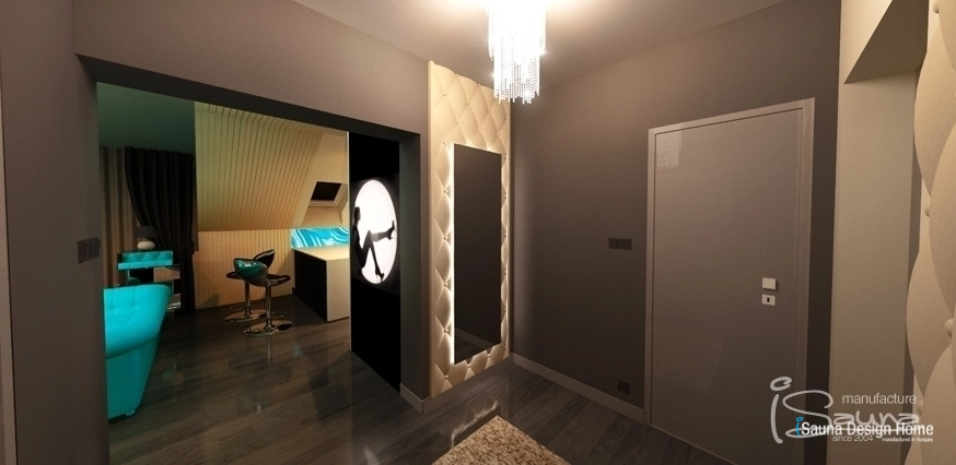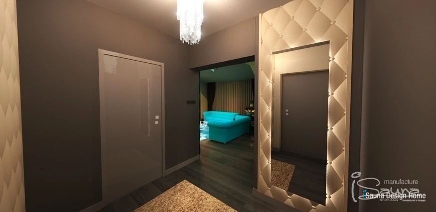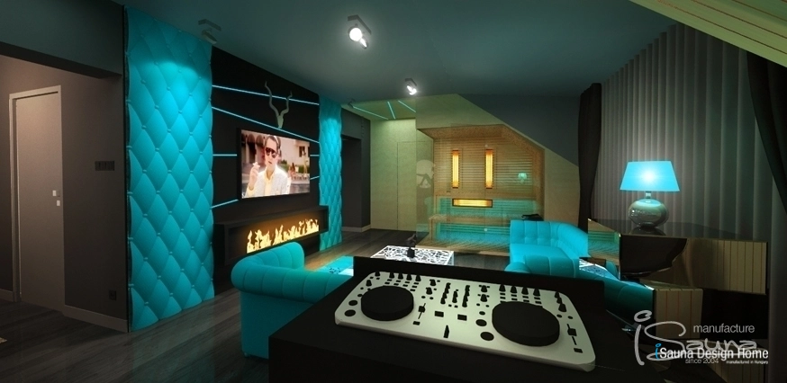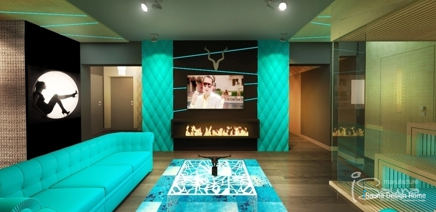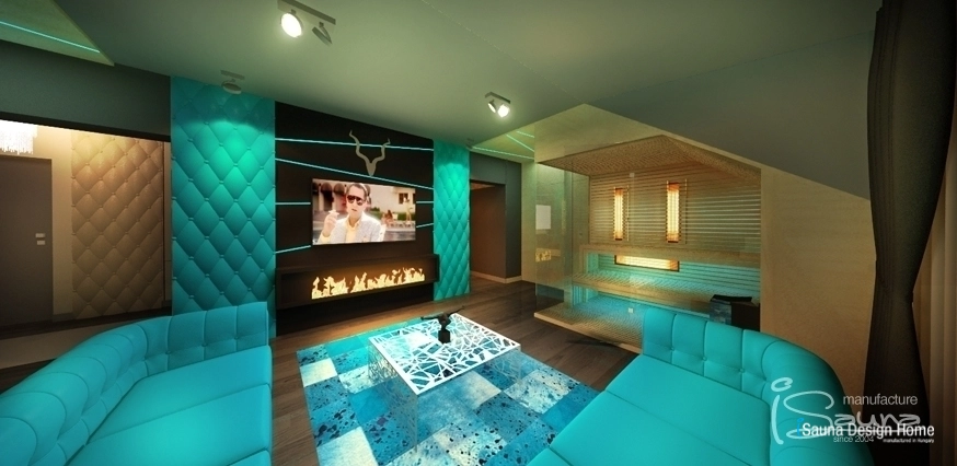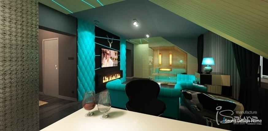 Útulnosť, eleganciu a exkluzívny štýl obývačky dáva kombinácia biokrbu, kombinovanej sauny a KARE nábytku. Jedinečná pohovka a zariadenie je Art Deco štýlu, ktoré dokonale súladia so sebou, s farbou obývacej izby a so saunou. Zabudovaná kombinovaná sauna je vyhotovená z fínskej osiky a prispôsobuje sa stropu obývačky.Súlad sauny a obývacej miestnosti zabezpečuje jedinečne vytvorená RGB Led svetelná terapia, ktorá bola okrem sauny zabudovaná i do stropu miestnosti.