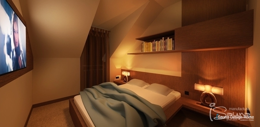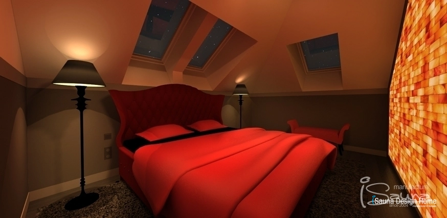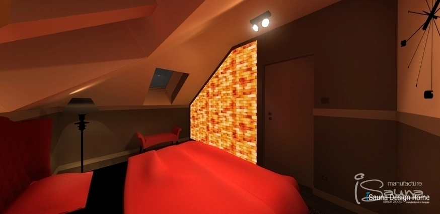 iSauna Manufaktura sa preslávila tým, že kde sa objaví pohodlie a oddych, tam je nevynechateľné zdravie.Na stenu oproti postele bola ručne vytvorená veľká Himalájska soľná stena na mieru so špeciálnym podvietením. Himalájska soľ zabezpečuje mikroklímu soľnej jaskyňe. Odtiene oranžovej farby soľnej steny sú v súlade s odtienmi postele a doplnkov spálne.