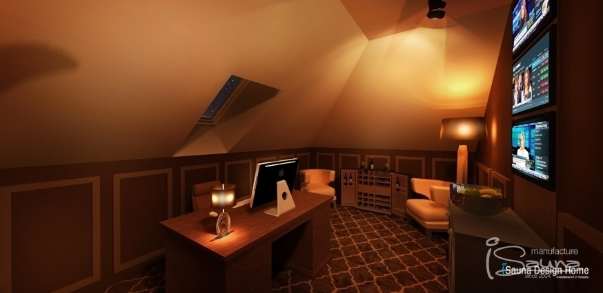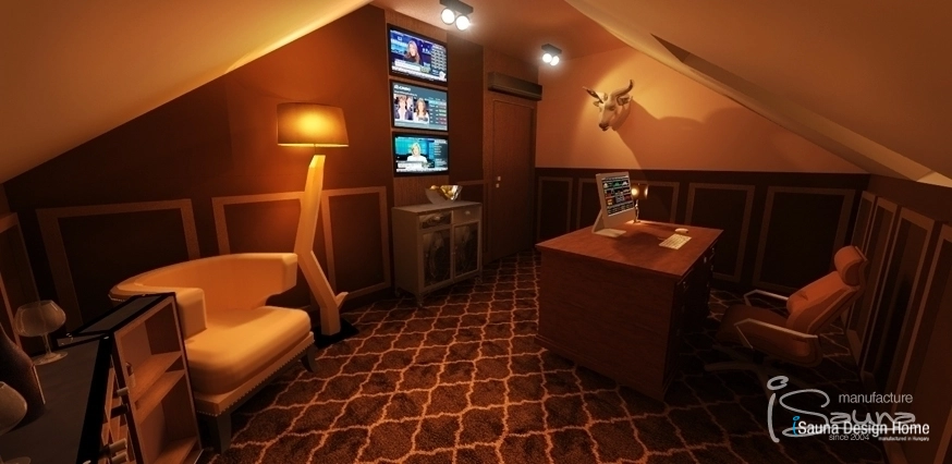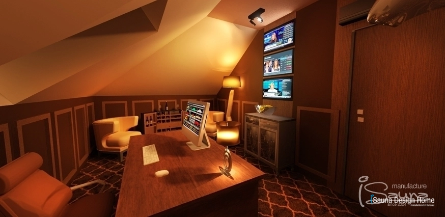 Moderný nábytok pracovne, jedinečné Kare doplnky cigar louge štýlu a ručne vyhotovený drevený kazetový obklad umožňuje tvrdú prácu trvajúcu až do noci. Danosti miesta sú ideálne pre umiestnenie stola a monitorov. Na stene za monitormi je tiež umiestnený kazetový drevený obklad. Odtiene hnedej prírodnej farby majú ukludňujúci vplyv na organizmus, a takto sa stala miestnosť dokonalou pre kľudné vykonávanie práce.
