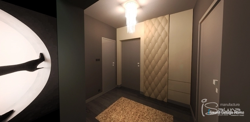 Jednoduchá, ale funkčnosťou a výzorom vynikajúca predsieň bola vytvorená v harmónií so šatňou. Taktiež sú tu umiestnené prešívané kožené obklady, zabudovaný nábytok krémovej farby, jedinečný kryštálový luster KARE a zrkadlo s LED podsvietením vďaka, ktorým je predsieň naozaj jedinečný a extravagantný.