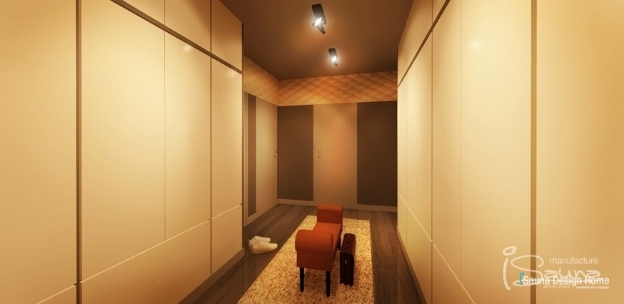 Šatna bola vytvorená ako duša bytu. Je na centrálnom mieste a má centrálnu rolu. Vytvorenie šatne uľahčuje ranné a večerné chystanie sa. Elegantný nábytok usmerňuje pozornosť na osobu, ktorá sa chystá. V hornej časti na stenách je prešívaný kožený obklad krémovej farby a takto je chystanie sa ešte štýlovejšie.