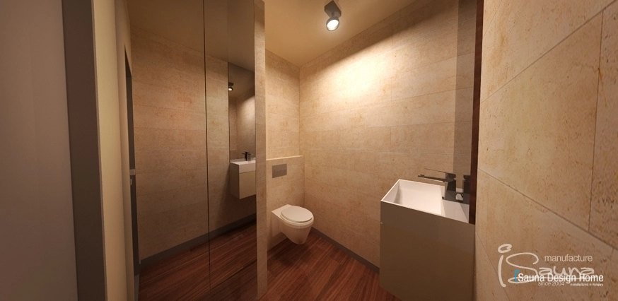 Sprchovová kabína stavaná na mieru je i parnou kabínou a jej pohodlnosť zabezpečuje sedadlo zo Süttő vápenca. V kúpeľni nájdete ešte dvojmiestnu vaňu, ktorá rozmaznáva svojích užívateľov s perličkovým kúpeľom a vedľa zabudovaný biokrb zabezpečuje príjemnú atmosféru. Na svetlých povrchoch je umiestnený drevený obklad z amerického orechu s vysokým leskom, ktorý je v harmónií so svetlými povrchmi.