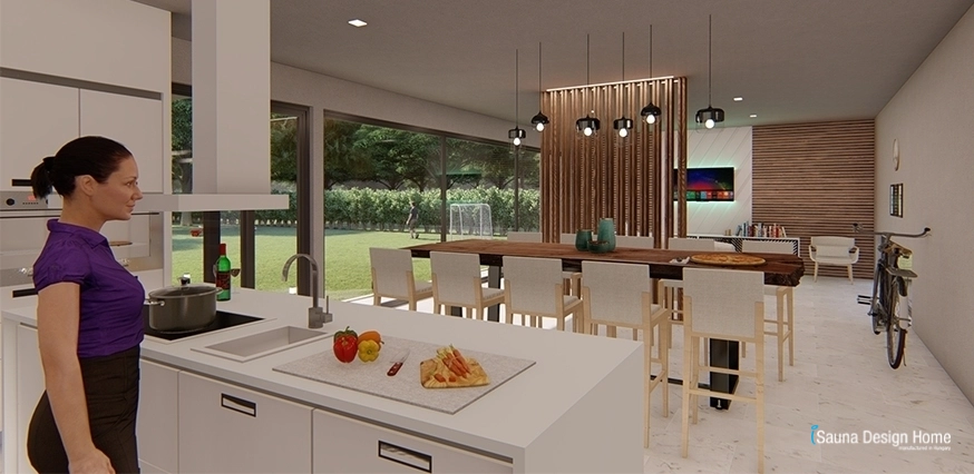 V tomto rodinnom dome čo bol postavený v minimalistickom štýle zohrávali drevené obklady, dôležitú úlohu a venovali sme tiež veľkú pozornosť dôslednému použitiu. Obývacia izba a jedáleň sú oddelené dobre navrhnutou drevenou predelovacou / oddelovacou stenou.