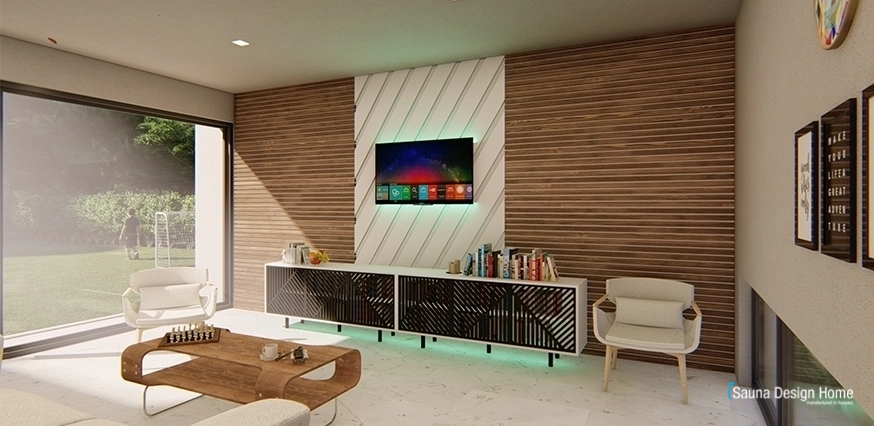 Hlavnú úlohu v obývačke dostala extravagantný drevený nástenný panel pre TV pozadie. Samozrejme, výber dreva je tiež veľmi dôležitý, v tomto prípade výber padol na čokoládový Thermowood jaseň.