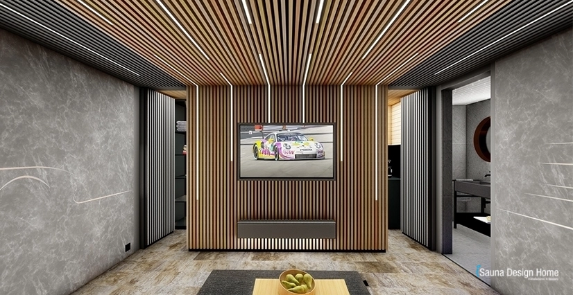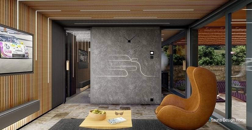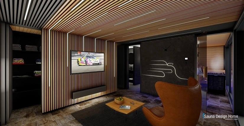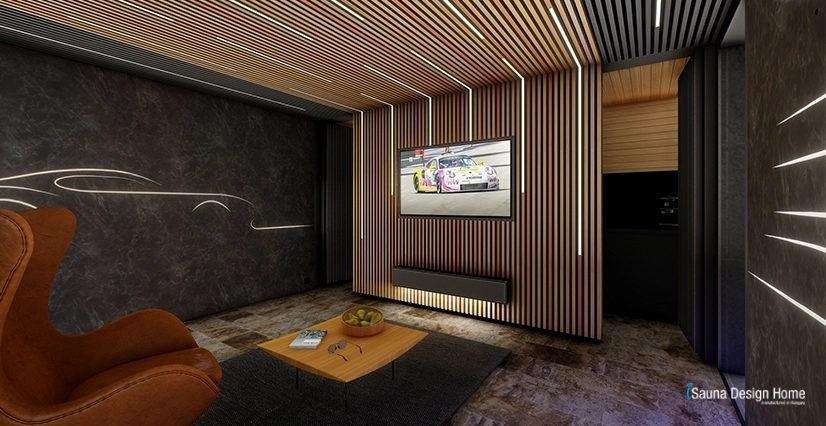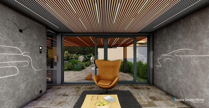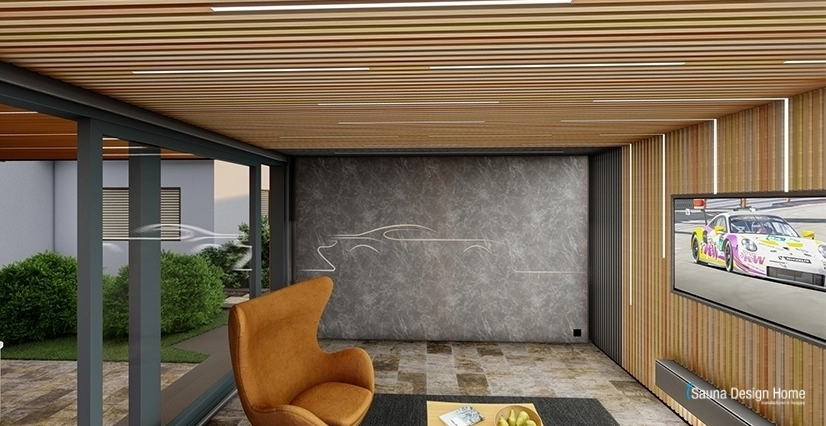 Rovnakú dizajnovú stenu sme postavili na zadnej stene odpočíváne, pozdĺž s nepravidelne zapustenými LED pásmi a túto líniu sme požili i pri streche. Dizajnová stena pokračuje aj na strope saunového domu. Dve bočné steny sauna domu sú natreté tmavo šedo s kamenným efektový povrchu, do ktorého je vyrytá silueta športového vozidla špeciálnym osvetlením.