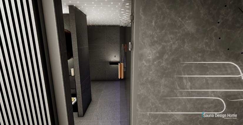 Náš klient okrem zážitkovej sprchy a WC mal aj jednu špeciálnu požiadavku na ľadu studňu. Strojárenská časť zariadenia na výrobu ľadu je skryté, takže vidíme iba misku, ktorá drží ľad, a kohútik, ktorý vydáva ľad. Miestnosť má steny tmavosivé, strop biely doplnený hviezdnou oblohou, má efekt ľadovej jaskyňe. Špeciálnym riešením je, že na terasu sa dá dostať priamo zo sauny cez hliníkové posuvné dvere. Medzi spoločenskou miestnosťou a terasou sa nachádzajú tiež posuvné dvere. Jedna polovica terasy bola uzavretá, pod ktorou dostalo miesto vírivka. Priestor pred saunou je otvorený, takže terasa môže v lete slúžiť aj ako slnečná terasa.