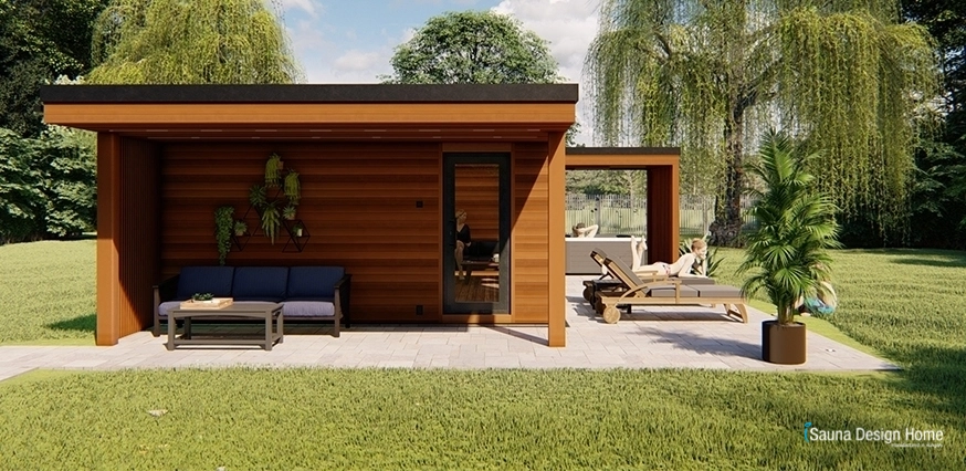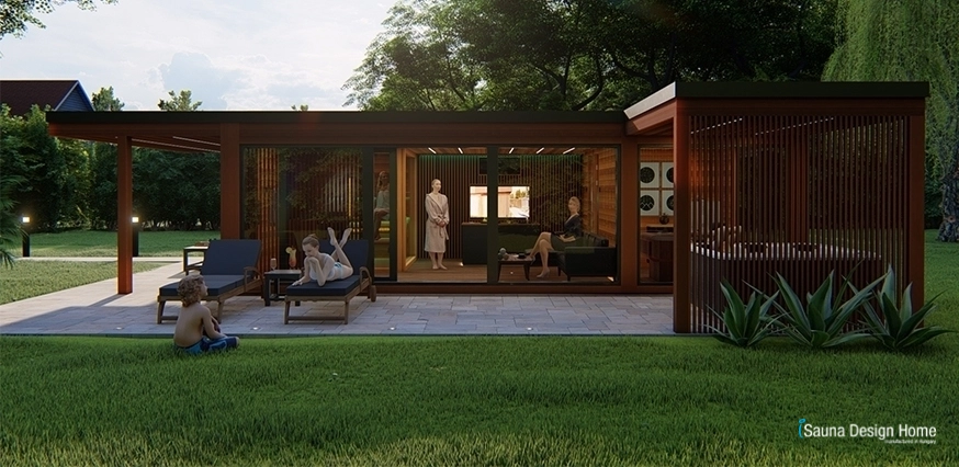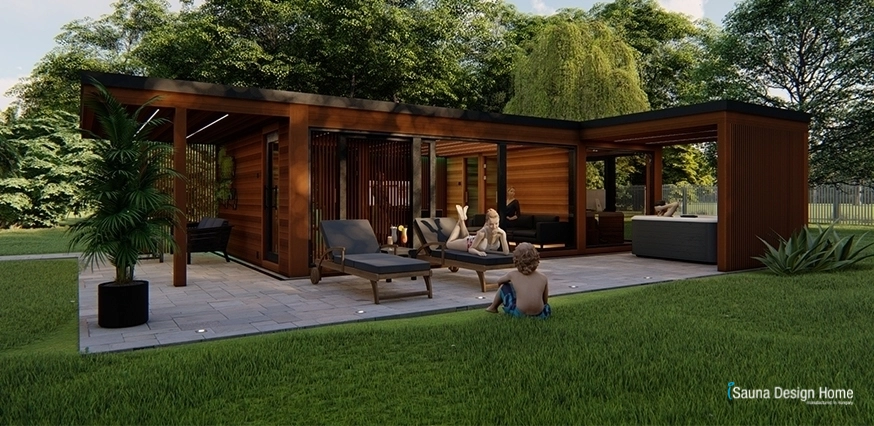 Štýlový, moderný saunový dom sa vyznačuje otvorenosťou, prirodzenosťou a jednoduchosťou, pričom všetko je vedome navrhnuté a kreatívne zariadené. Moderný saunový dom na mieru s jednoduchosťou tvarov, postavený v krásnom zelenom prostredí. Nepretržitý a ľahký prechod medzi exteriérom a interiérom sauna domu na mieru zaisťujú jedinečné panoramatické zasklenie a systém posuvných dverí s hliníkovým rámom. Veľké presklené plochy a terasa v tvare „L“ sa otvárajú do záhrady a na panoramu.