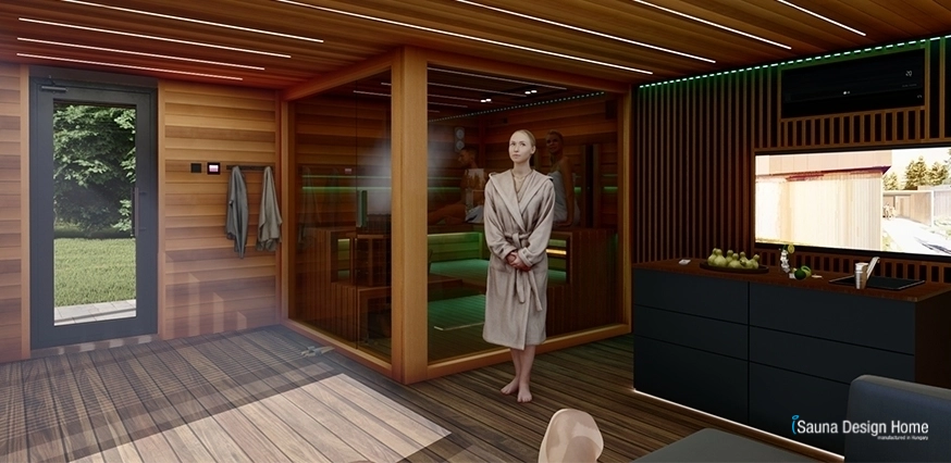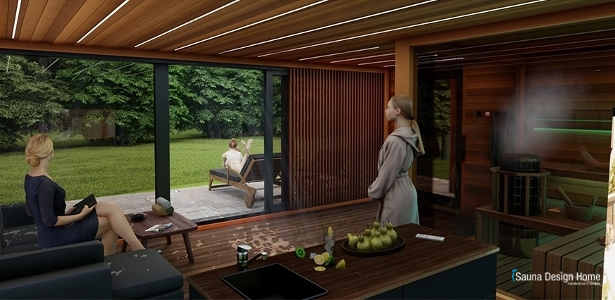 V interiéri sauna domu tiež dominujú prvky prírodného dreva. Oddychová zóna saunového domu má kuchynský ostrov, za ktorým je z kanadského červeného cédru vytvorená krásna ručne vyhotovená design stena na mieru. Tu je umiestnený aj televízor. Za jedinečnú atmosféru v oddychovej časti sauna domu zodpovedá RGB náladové osvetlenie v streche. Členovia rodiny môžu si vybrať farbu osvetlenia v oddychovej zóny podľa svojho vkusu. V našom modernom sauna dome bolo umiestnená aj kombinovaná rodinná sauna, priestranná kancelária, toaleta a sprcha. Môžeme smelo povedať, že tento moderný saunový dom postavený na mieru uspokojí všetky potreby, ktoré môže rodina potrebovať pri príjemnom wellness víkende. Aby bol pobyt ešte príjemnejší a zábavnejší, nájdete na terase sauna domu aj rodinnú vírivku a záhradný relaxačný kútik.