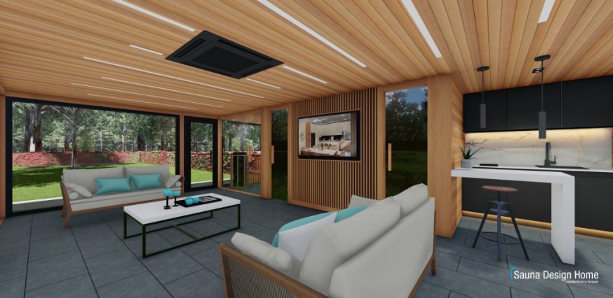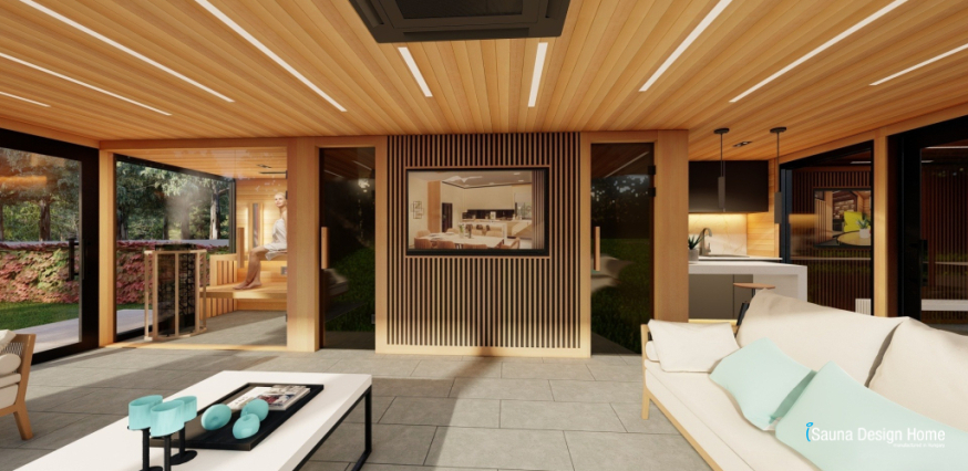 Kombinovaná sauna s infražiaričmi v interiéri podporuje hĺbkovú relaxáciu svalov a regeneráciu, zatiaľ čo integrovaná hudobná terapia vytvára upokojujúcu atmosféru. Po saunovaní ponúka zabudovaná multimediálna stena a smart TV možnosť individuálneho oddychu.