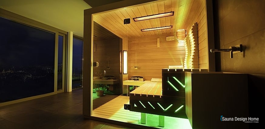 Bočná aj predná časť na mieru vybudovanej luxusnej sauny je vyrobená z vodočíreho tvrdeného saunového skla, vďaka čomu sa sauna stala otvorenou, tak smerom k vnútorným priestorom, ako aj smerom na mesto.