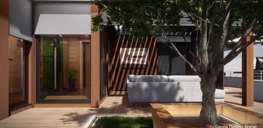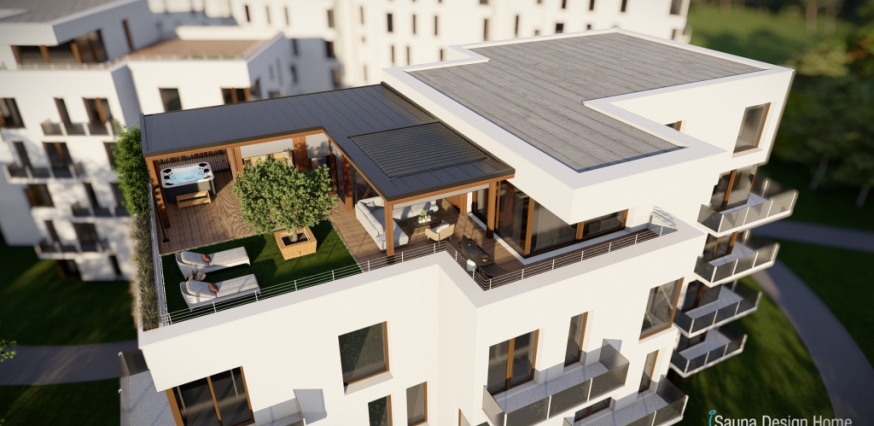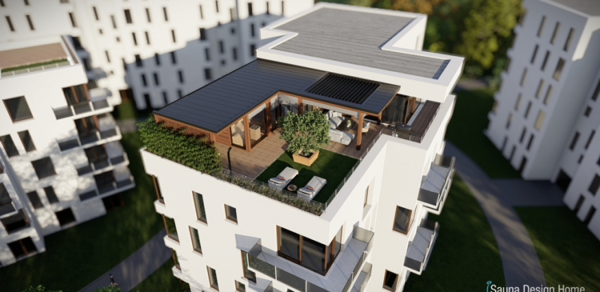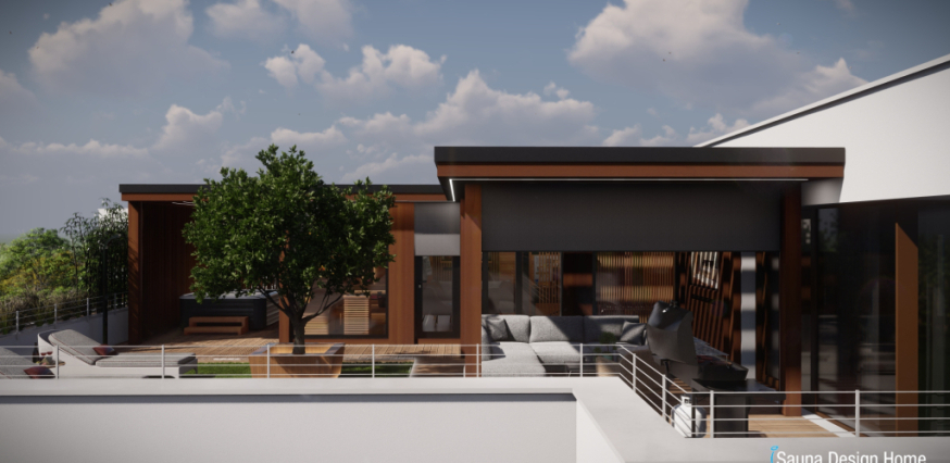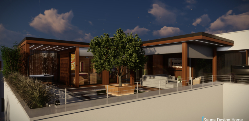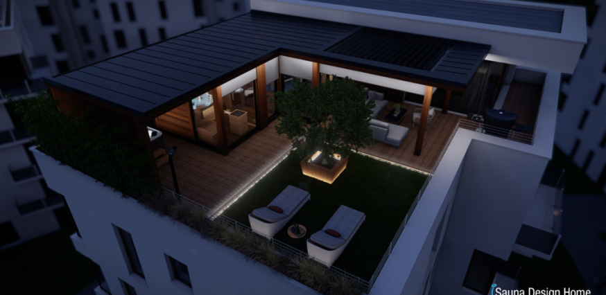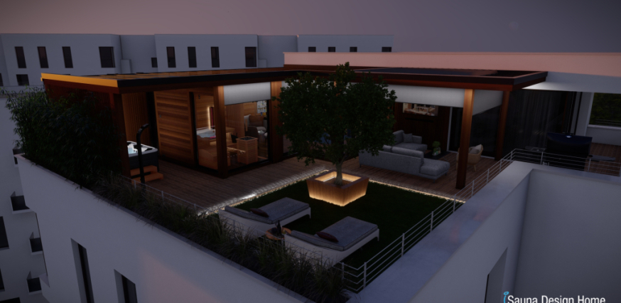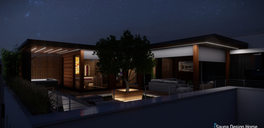Exkluzívny saunový dom je vyrobený z prémiového kanadského červeného cédra a je doplnený prístreškom s RGBW dizajnovým osvetlením. Každá zóna wellness domu je multifunkčná a jeho centrálnym prvkom je vírivka Villeroy and Boch, ktorá je vybavená pergolou, čo zabezpečuje intimitu a ochranu pred nepriaznivými poveternostnými podmienkami.