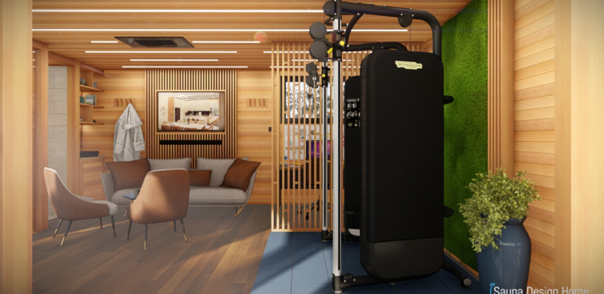 Ďalej sme nainštalovali oddychovú zónu s jedinečným nábytkom a policovým systémom z masívneho dreva, ktorý slúži ako spoločenský priestor. Výber farieb a drevených obkladov prispieva k vytvoreniu teplej a prírodnej atmosféry v interiéri. Mysleli sme aj na ľudí túžiacich po aktivite, preto sme vytvorili osobné fitnescentrum vybavené prémiovými posilňovacími zariadeniami.
