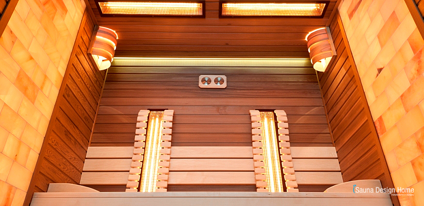 V tejto kombinovanej saune na mieru je perfektným doplnkom himalájska soľná stena, ktorá má na náš organizmus nielen liečebné účinky, ale i účinky svetelnej terapie dôraznymi oranžovými odtieňmi.