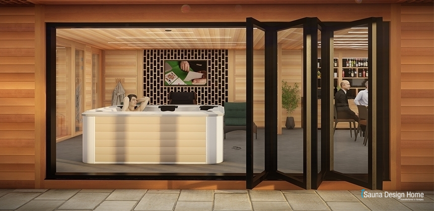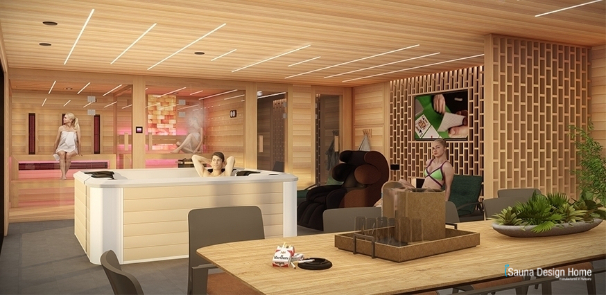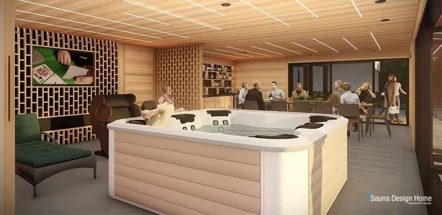 Po užívaní si sauny je možnosť na osvieženie sa v pohodlnej miestnosti so sprchou a toaletou. Dokonalý oddych vieme ešte stupňovať so šesťmiestnou priémiovou vírivkou a masážnými kreslami čo sú umiestnené v salóniku. Moderný dizajn minimalistických prvkov vyvažujú prírodné látky a zladené farby a takto vytvárajúce priateľné a obývateľné prostredie. Nábytok na mieru obslúžia všetky potreby objednávateľa a spoločnosti priateľov.