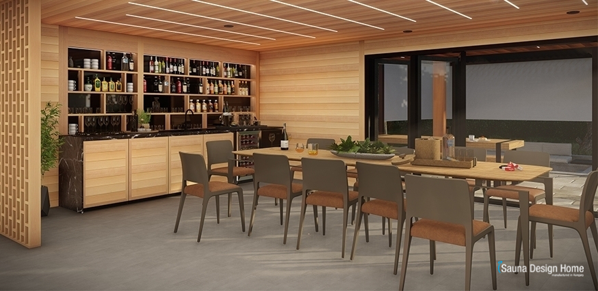 Jedinečná kuchyňa vyrobená z masívného kanadského červeného cédru kombinovaná s modernou pracovnou doskou zo žuly, v ktorom dostalo miesto kombinovaná chladnička a chladnička na víno. Čierna sklenená zadná stena políc nad ňou je zvýraznená nepriamym osvetlením. Vďaka tomu dostáva táto časť saunového domčeka skutočný charakter baru.