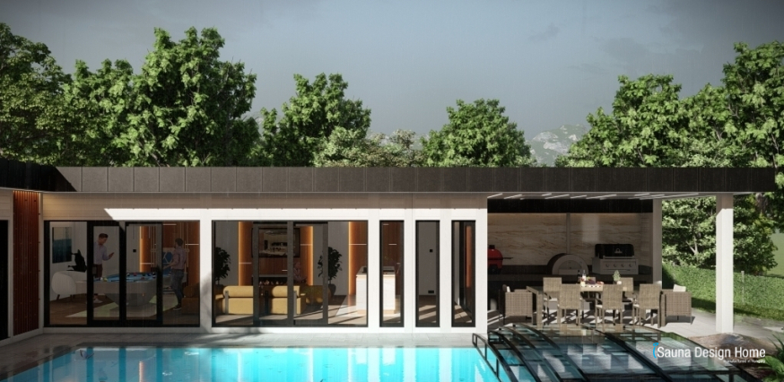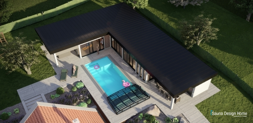 Výslovnou požiadavkou nášho klienta bolo, aby mohol organizovať rodinné a priateľské stretnutia v priestrannom a pohodlnom prostredí, aby si podujatie mohli užiť všetci, od mladých až po starých, bez ohľadu na vek. Na mieru navrhnutý bazén s napnutým vodným zrkadlom, tiež s na mieru vyrobeným plávajúcim, motorizovaným, mimoriadne plochým hliníkovým krytom bazéna.