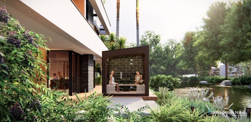 Exteriér sauny je vyrobený z jedinečných lamelových dizajn prvkov jasňového dreva. Zatiaľ čo interiérový dizajn sauny je vytvorený horizontálnými líniami s podsvietením.