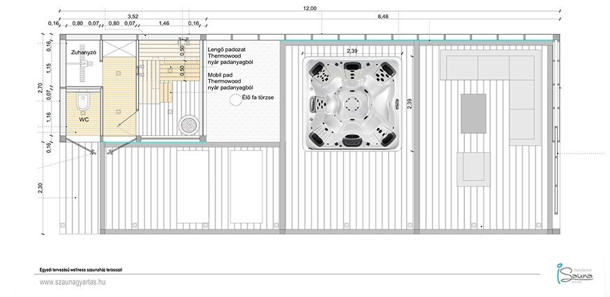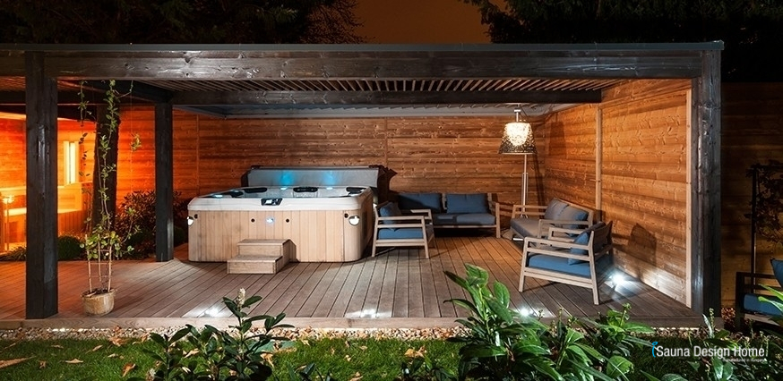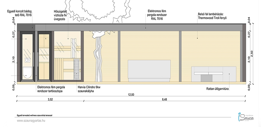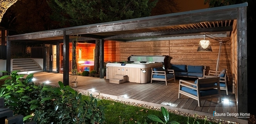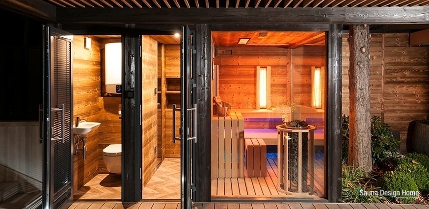 Do exteriérového wellness sauna domu bola zabudovaná kombinovaná sauna s funkciami fínska sauna a infrasauna, s panoramatickým tepelne izolovaným presklením, sprchou, WC s vonkajším vchodom, spojovacou chodbou, jedinečným vstavaným nábytkom, inteligentným systémom elektrického podlahového vykurovania a elektrickým prietokovým ohrievačom vody.