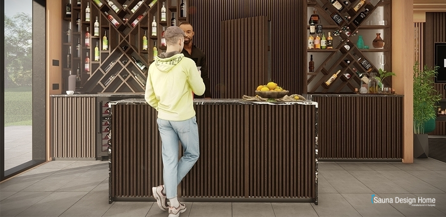 Prvky z masívneho kanadského červeného cédra sú kombinované s thermowood jaseňom. Použitím čokoládovohnedého thermowood jaseňa sme dosiahli prirodzený kontrast medzi drevenými obkladmi stien. Barové pulty z masívneho dreva vytvorené na mieru sledujú línie dizajnových prvkov.