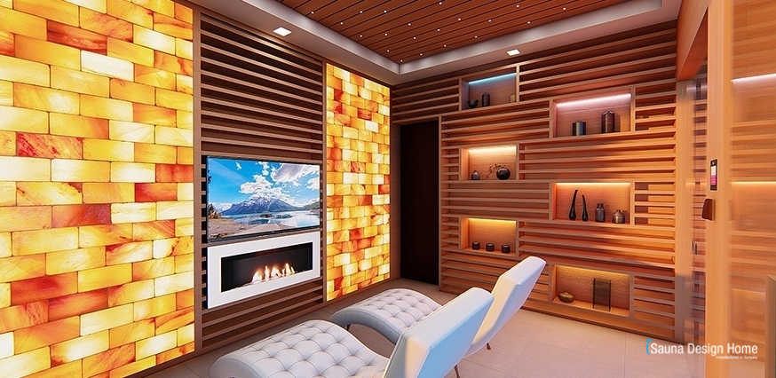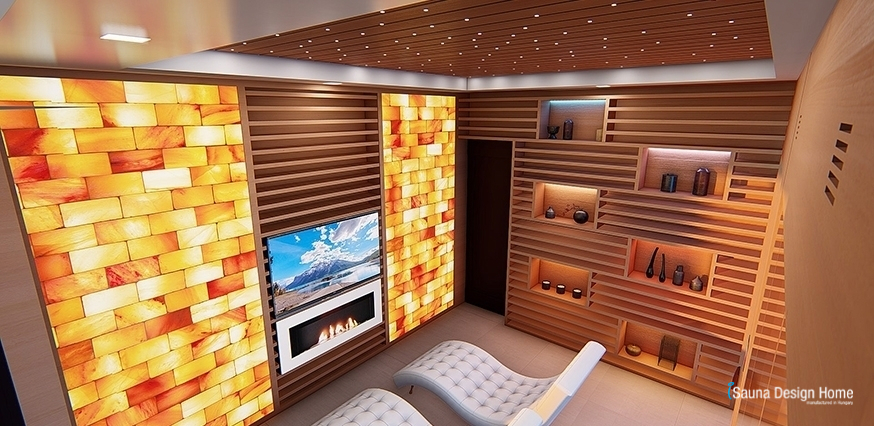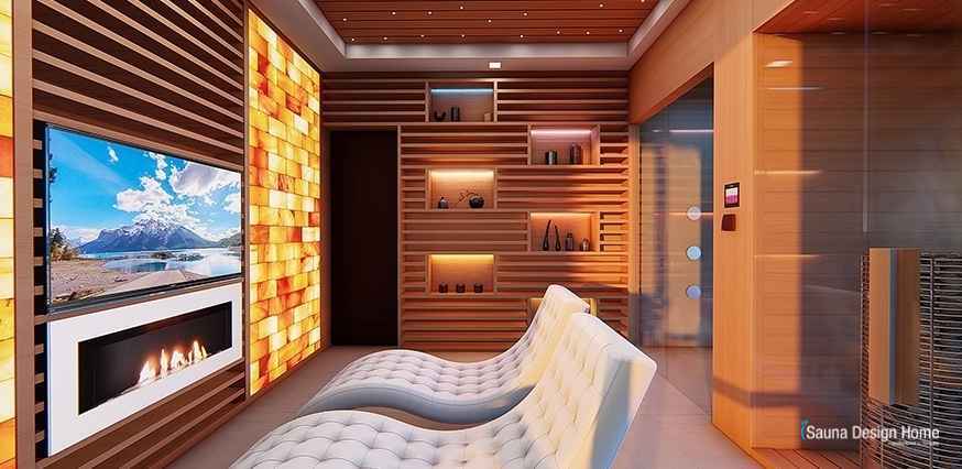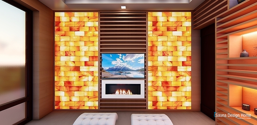 V oddychovej časti domáceho wellness bola navrhnutá aj veľká himalájska soľná stena s krbom a inteligentným televíziou.