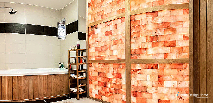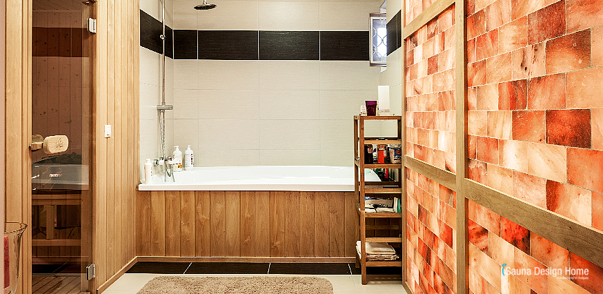 Sauna v kúpeľni sa nachádza v jednej rovine s obkladanou stenou miestnosti, oproti himalájskej soľnej steny.
