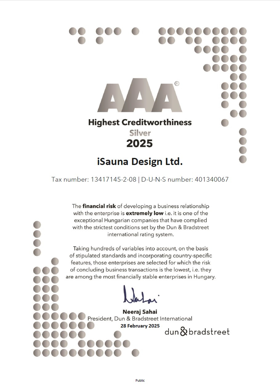 Spoločnosť ISauna Design Kft. získala certifikát Dun & Bradstreet AA (dvojité A), čo znamená, že finančné riziko nadviazania obchodného vzťahu s nami je veľmi nízke.