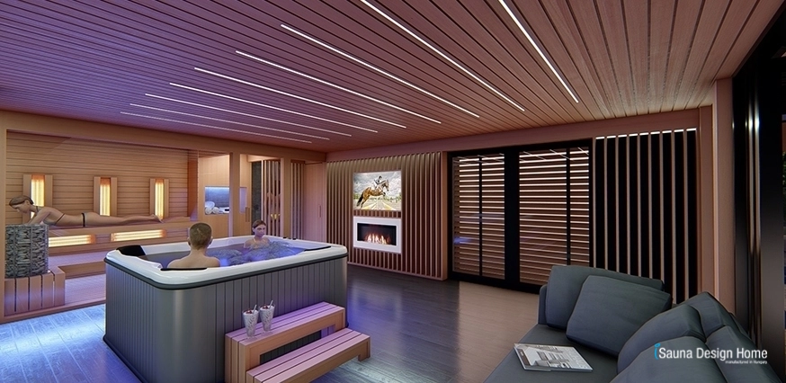 V rámci súkromnej sauna wellness jednotky bola vytvorená oddychová časť s vírivkou Villeroy & Boch R6L, Smart televízorom, krbom, zvukovým systémom Bluetooth s IP ochranou a skrytým RGB LED podsvietením.