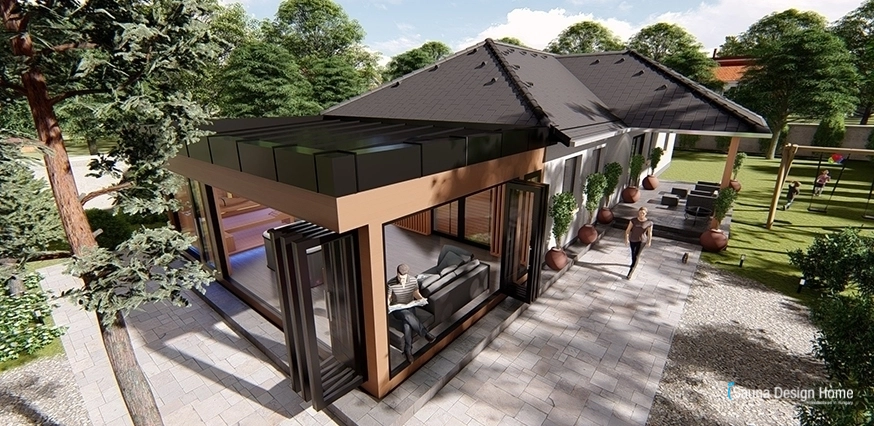 K ideálnemu domovu patrí wellness zimná záhrada so saunou, ktorá poskytuje kvalitnú rekreáciu pre všetkých členov rodiny.