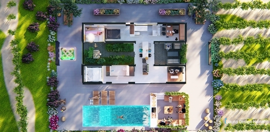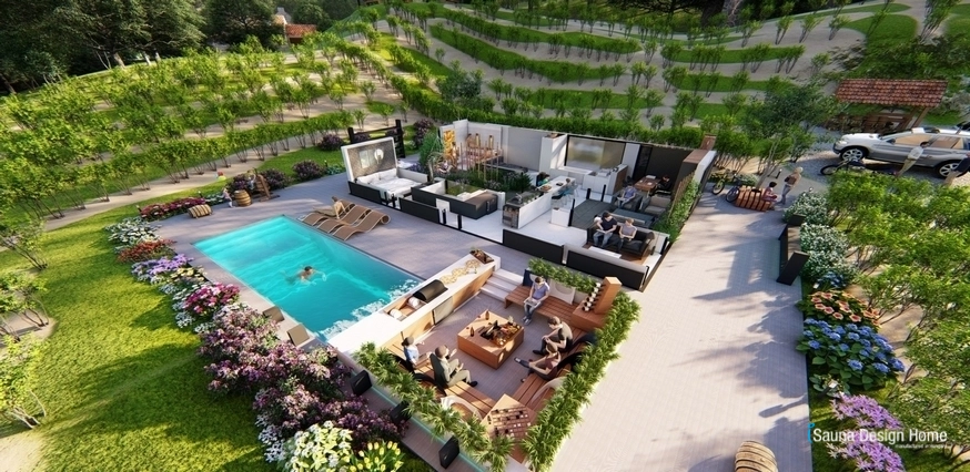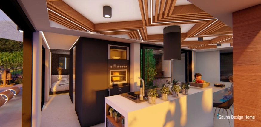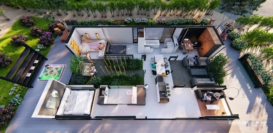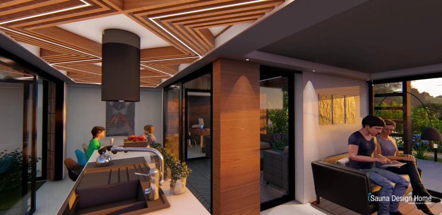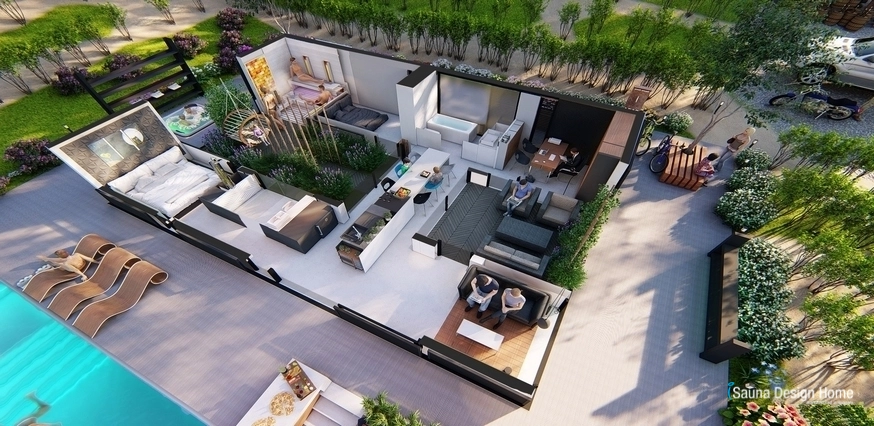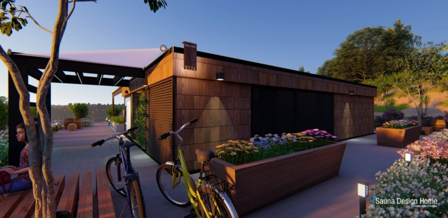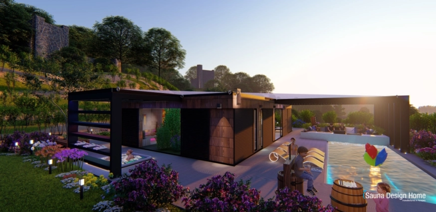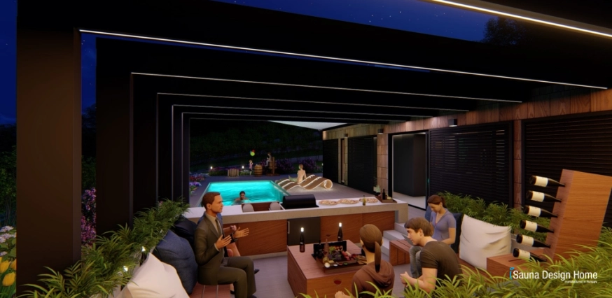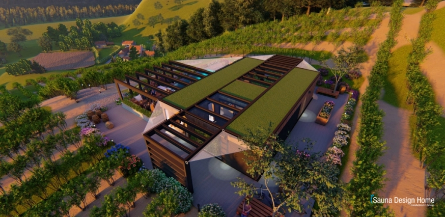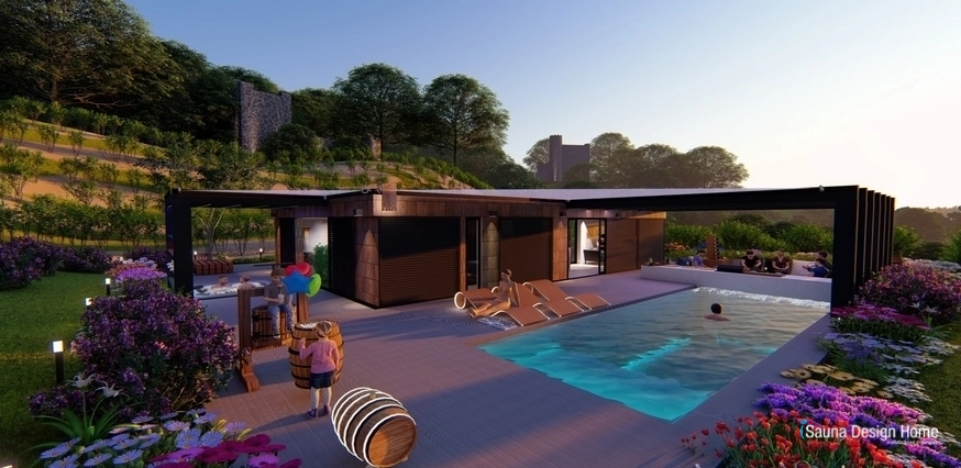 Počas plánovania vonkajšieho wellness sauna domu dostalo miesto kombinovaná sauna, obývacia izba a kuchyňa s mechanikou, predĺžená jedáleň, 2 spálne, 1 pracovňa, 2 kúpeľne, zimná záhrada, záhradný dvor / záhradná záhrada. Využiteľnosť sauna domu po celý rok je zaručená najmodernejšou izoláciou, zasklenením, tieňovacou technológiou, modernou mobilnou klímou a podlahovým vykurovaním, ktoré je úsporné na elektrickú energiu. Jednoduchý a stabilný priechod na terasy zabezpečujú hliníkové posuvné dvere z 3-vrstového izolačného skla. Ďalsie extra funkcie na vonkajšej terase sauna domu zabezpečujú úplnú relaxáciu! Ako napríklad: Prémiová vírivka zapustená do podlahy, bazén s protiprúd, gril kútik, a Louge bár. Komfortný sauna dom vo vinohradníctve je dokonalým doplnkom k vinárenským vyletom a školení budovania tímu firiem.