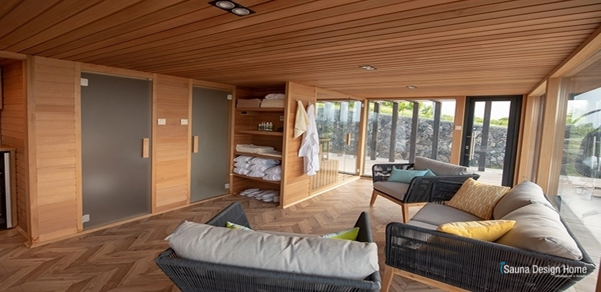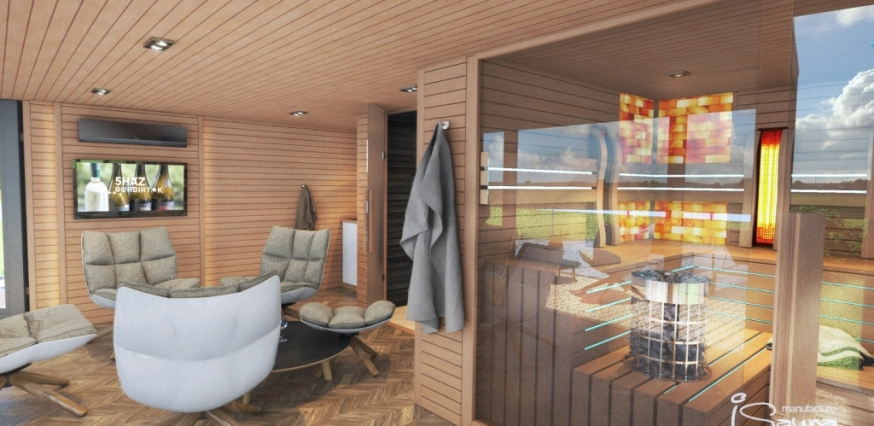 Kombinovaný saunový dom maximálne vyhovuje všetkým požiadavkám. Je v nej infrasauna, fínska sauna, parná sauna a himalájska soľná terapia. Okrem toho sú jeho súčasťou sprcha so šatňou, oddychový priestor, kuchynka s jedálňou, televízor a posuvné sklené dvere.