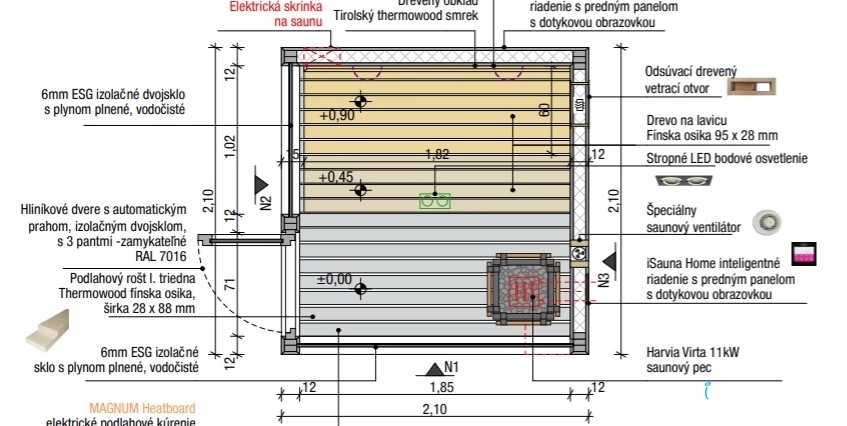 • Kalené, izolačné (4 + 4) číre zasklenia na prednej časti a pravej strane sauny